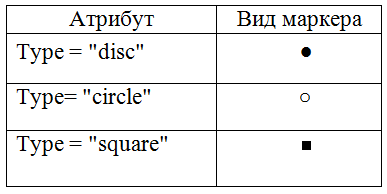 Маркеры могут принимать один из трех видов: чёрный круг (по умолчанию), окружность и чёрный квадрат. Для выбора стиля маркера используется атрибут type тега <ul>. Допустимые значения атрибута приведены в таблице: